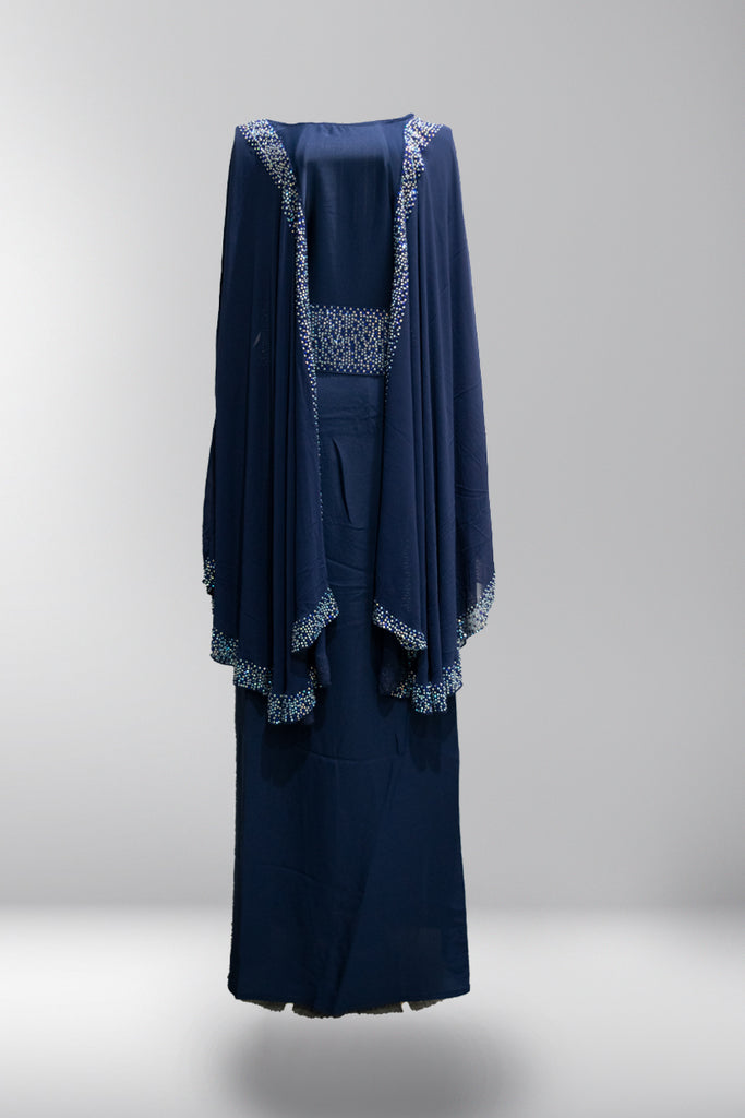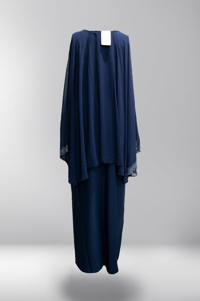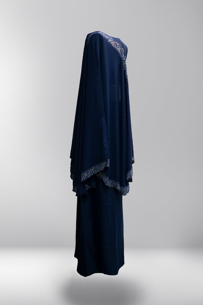 The Noura cape sleeve abaya features a diamanté encrusted border and belt. This ultra glam abaya is perfect for summer evenings out. Complete with matching hijab.