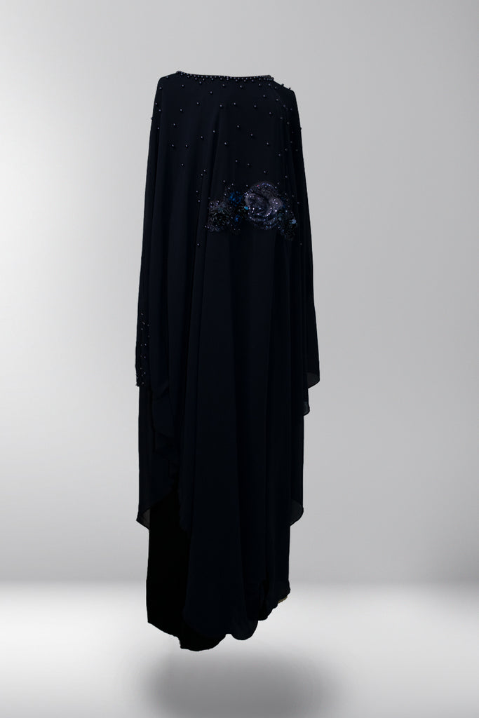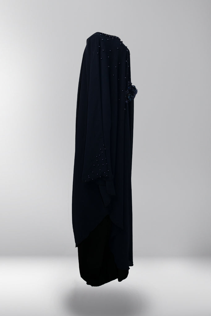 This elegant abaya features 3D hand crafted embellished flowers. It has an inner slip dress attached with a sheer outer batwing attached. Complete with matching hijab.
